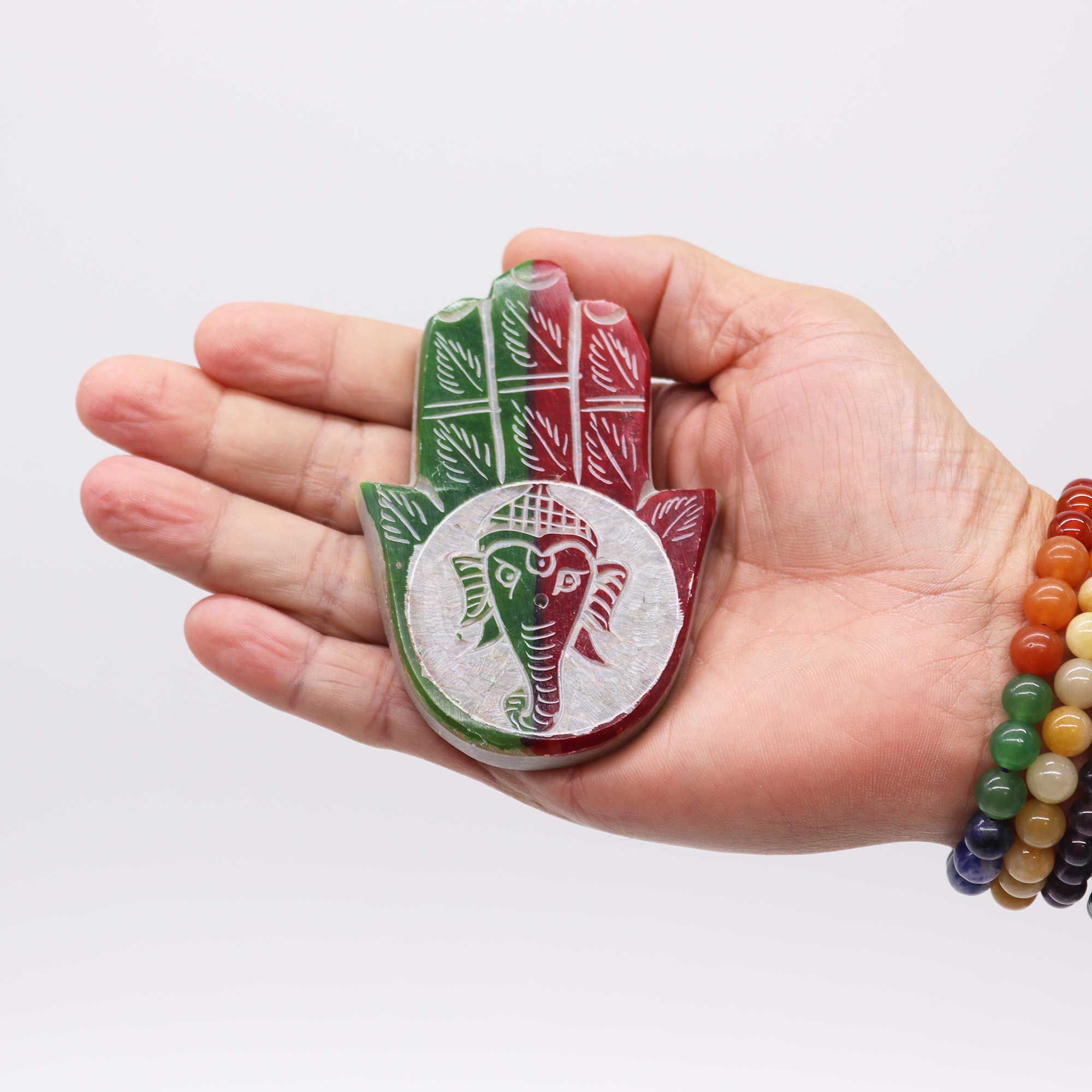 El Porta-incienso Hamsa de Esteatita 9x6cm — Ganesha es una pieza artesanal que une dos de los símbolos espirituales más poderosos de la cultura oriental: la Mano Hamsa, protectora y auspiciosa, y Ganesha, el dios elefante hindú que elimina obstáculos y trae buena fortuna. Tallado a mano en piedra esteatita natural, este porta-incienso es tanto una herramienta funcional como un objeto de devoción y decoración espiritual.