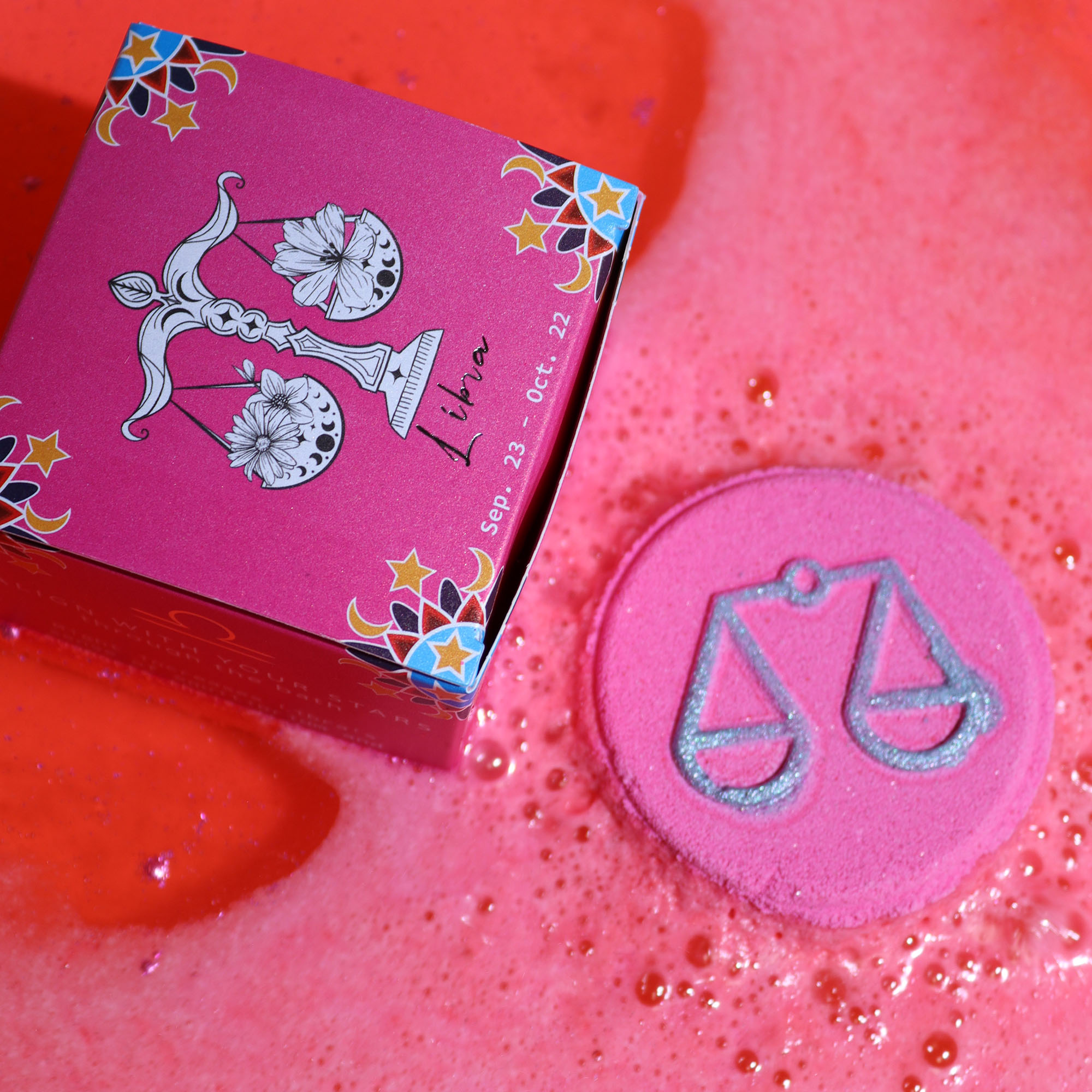 Cada bomba se disuelve creando una sinfonía de colores y aromas que satisface el exigente sentido estético de Libra. El agua se transforma en un lienzo sensorial donde los tonos y las fragancias se equilibran con la precisión de la balanza zodiacal.